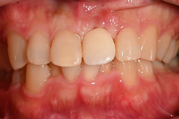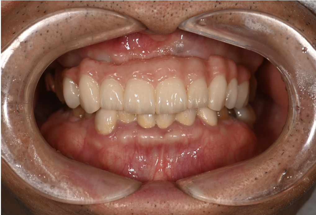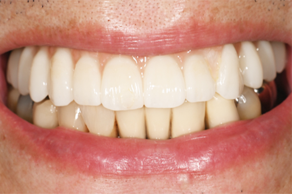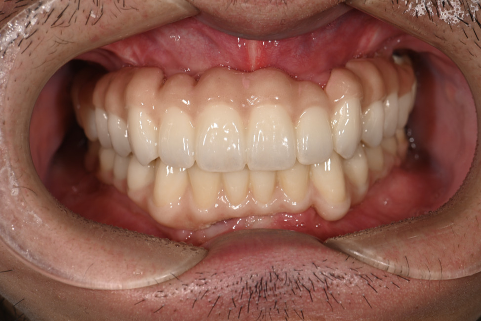 上顎に対するインプラント治療を行った。 午前中にインプラントの土台を入れ、夕方に上部構造(歯)を装着。 1日で噛めるようになる治療法。 |