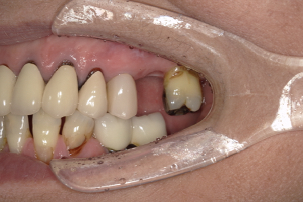 治療内容 | 右下奥歯が割れていたため抜歯、その後インプラント治療を行った。(左の写真は抜歯後の写真) |