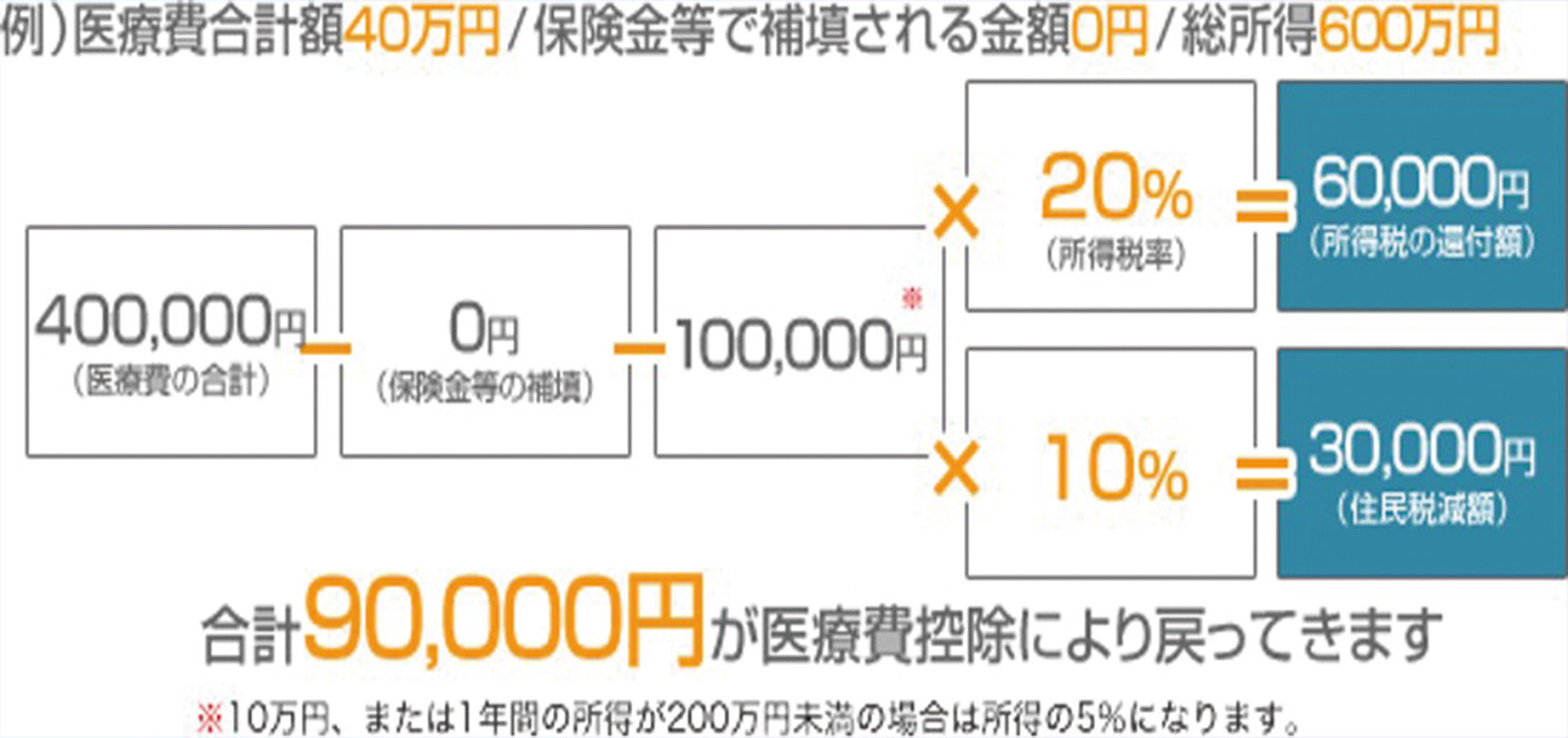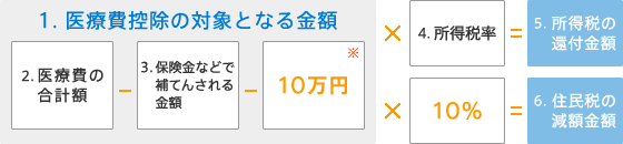 1年間に支払った医療費の合計が10万円以上(所得が200万円未満の場合は、 医療費の合計が1年間の所得の5%を超えていること)の場合、確定申告で医療費控除の 申請手続きをすれば、所得税の還付と、翌年度の住民税減額を受けることができます。 医療費控除金額は以下のように計算します。