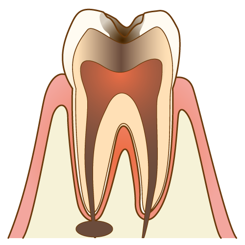 象牙質の内側の歯髄にまでむし歯が達したものです。この段階では、歯髄に細菌が進入し激しい痛みを伴うことがあります。