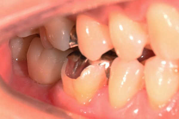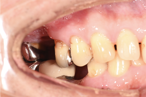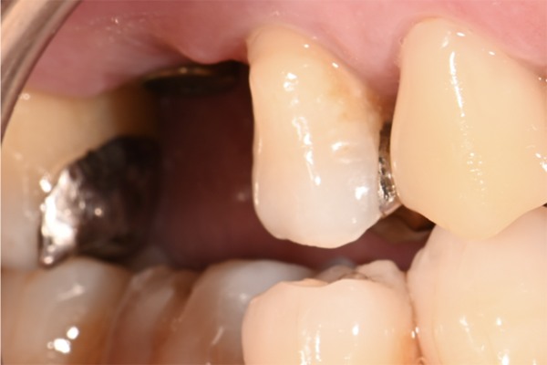 治療内容 | 右下奥歯が割れていたため抜歯、その後インプラント治療を行った。(左の写真は抜歯後の写真) |