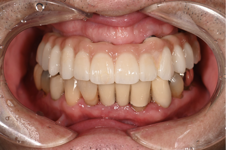 上顎に対するインプラント治療を行った。 午前中にインプラントの土台を入れ、夕方に上部構造(歯)を装着。 1日で噛めるようになる治療法。 |