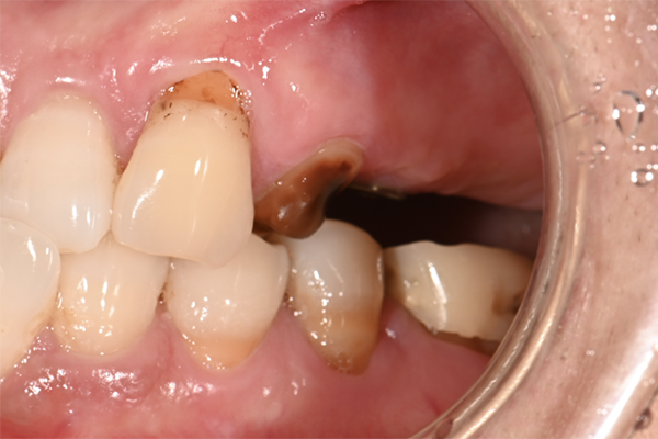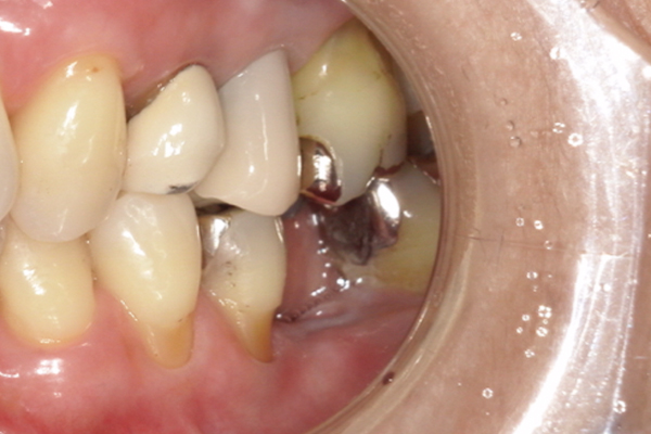 治療内容 | 右下奥歯が割れていたため抜歯、その後インプラント治療を行った。(左の写真は抜歯後の写真) |