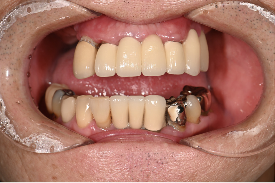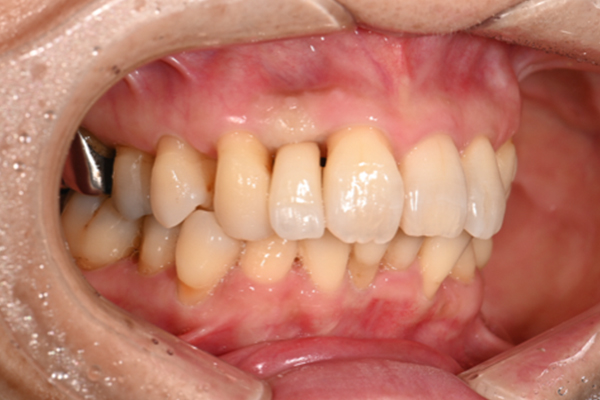 上顎に対するインプラント治療を行った。 午前中にインプラントの土台を入れ、夕方に上部構造(歯)を装着。 1日で噛めるようになる治療法。 |
