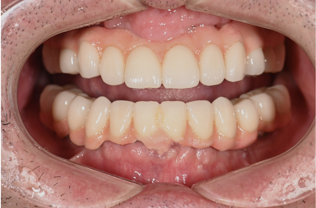 治療内容 | 午前中に上下顎共に重度の歯周病、虫歯のため全ての歯を抜歯させていただき下顎はインプラントの土台を3本埋入し歯型を取り午後に上部構造(下顎全ての歯)を装着、上顎は一度総入れ歯を装着させていただきました。 治療が1日で完了しその日のうちに噛めるようになります。 |