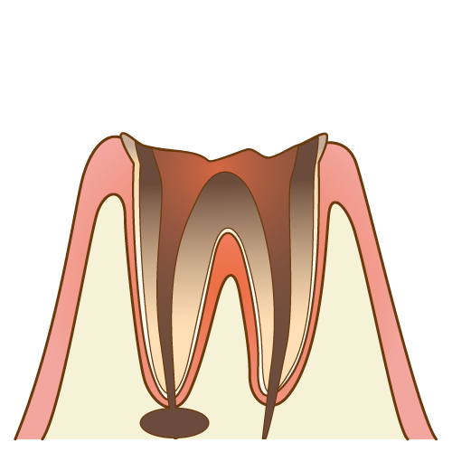 象牙質の内側の歯髄にまでむし歯が達したものです。この段階では、歯髄に細菌が進入し激しい痛みを伴うことがあります。