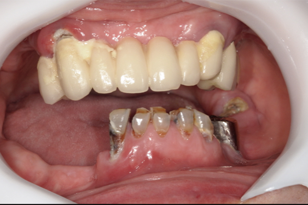 治療内容 | 午前中に上下顎共に重度の歯周病、虫歯のため全ての歯を抜歯させていただき下顎はインプラントの土台を3本埋入し歯型を取り午後に上部構造(下顎全ての歯)を装着、上顎は一度総入れ歯を装着させていただきました。 治療が1日で完了しその日のうちに噛めるようになります。 |