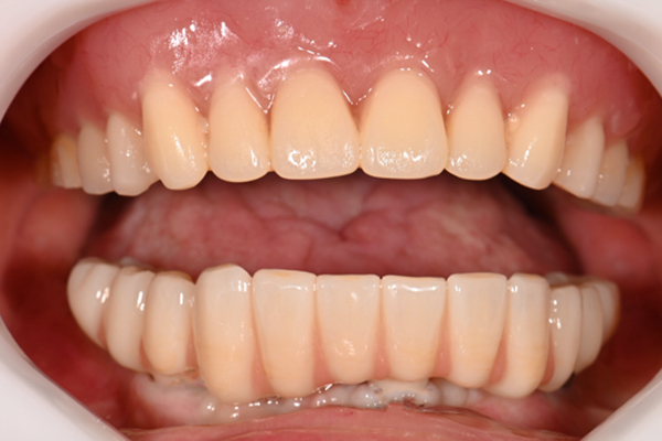 治療内容 | 午前中に上下顎共に重度の歯周病、虫歯のため全ての歯を抜歯させていただき下顎はインプラントの土台を3本埋入し歯型を取り午後に上部構造(下顎全ての歯)を装着、上顎は一度総入れ歯を装着させていただきました。 治療が1日で完了しその日のうちに噛めるようになります。 |